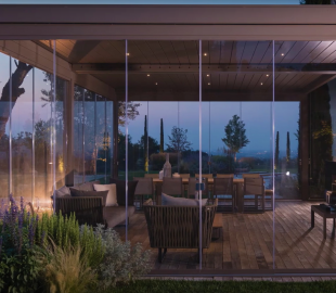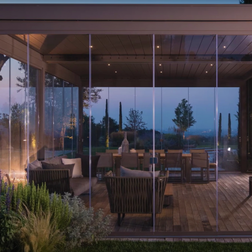 Agregue paredes de vidrio y puertas corredizas sin marco para disfrutar de su espacio al aire libre con calidez y comodidad durante todo el año.