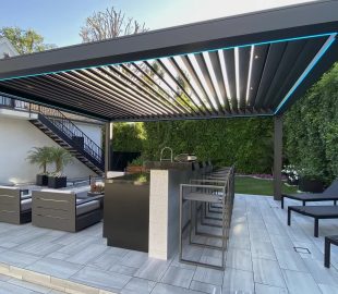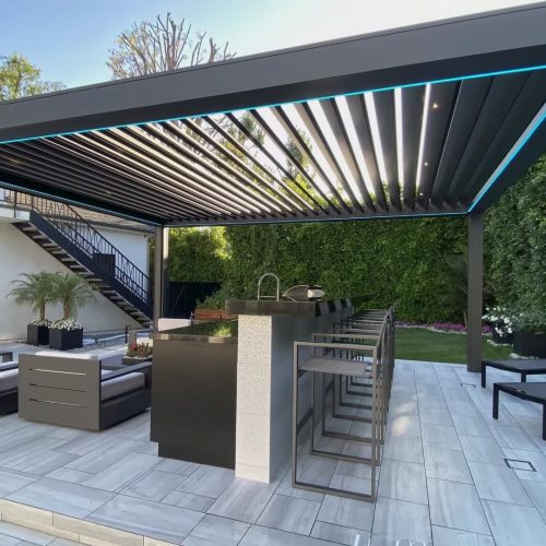 Disfrute de la vida al aire libre durante todo el año con nuestro increíble sistema de pérgola motorizada con control remoto que le permite ajustar el techo para protección solar, ventilación, iluminación y protección contra la lluvia según la temporada.